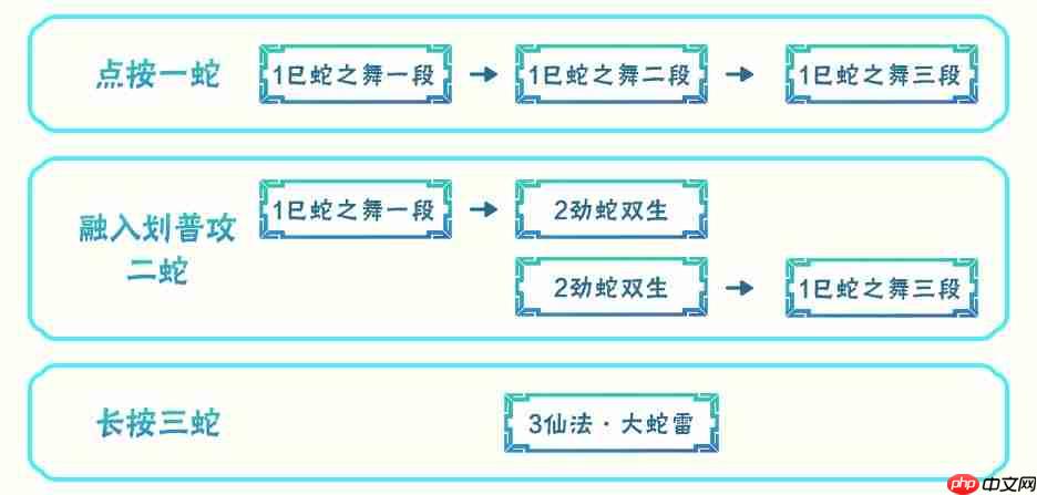 在点按释放一技能一段后,一技能二段划普攻可使用二蛇连续攻击;若直接释放二蛇攻击(一技能一段划普攻)后,在黄条结束前点按一技能则可释放三段攻击与敌人进行远距离拉扯。