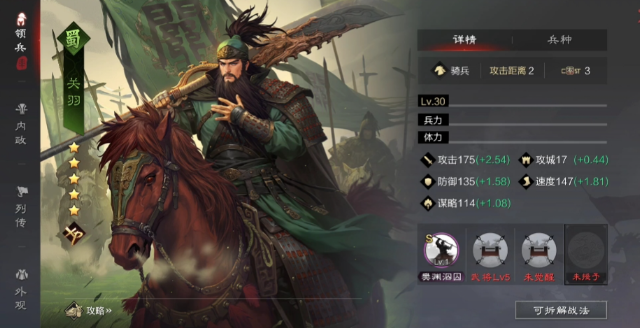 1、关羽战法推荐:人中吕布、愈战愈勇