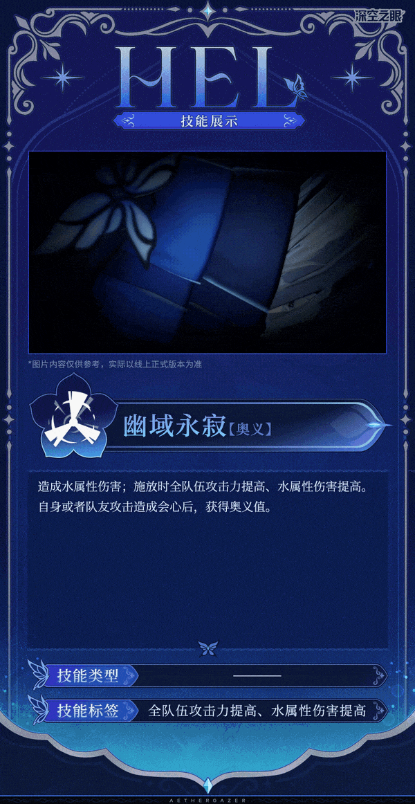 释放奥义/连携 水海拉/诗蔻蒂/执明/潮音爆伤+30% 其他水属性角色攻击力+40%