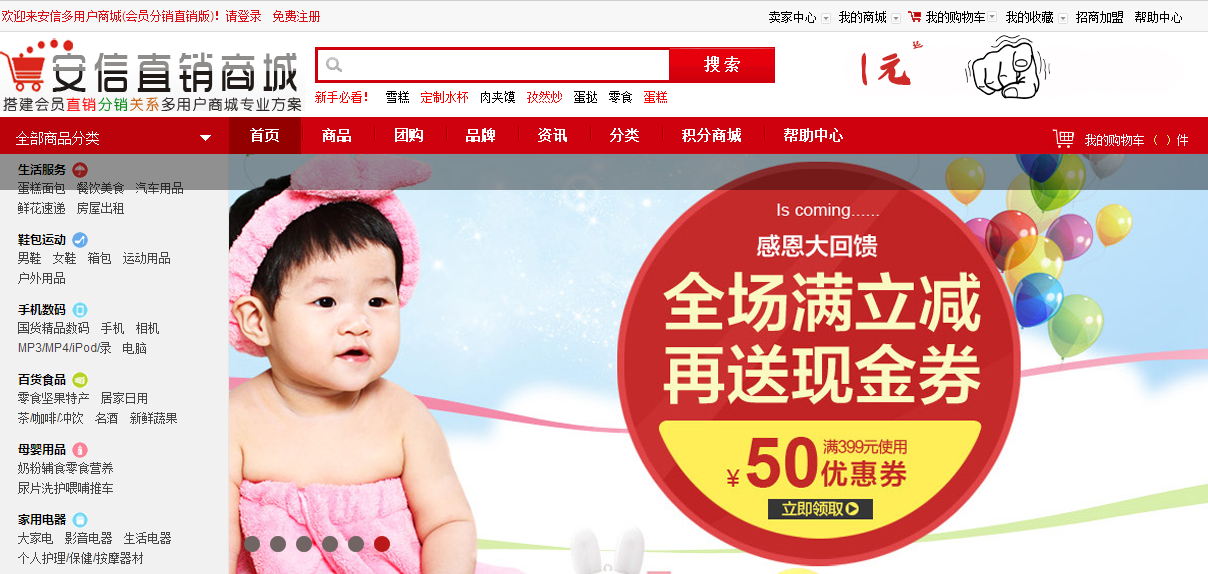 安信多用户直销分销商城系统v3_1 网站前台采用主流页面设计,主站模版布局时尚、新颖。用户注册系统采用一站通的模式,用户可以实现在线购物和开店以及帐户管理。用户中心界面友好、操作简洁方便,采取清晰的分项管理:即可以分别管理【我是买家】、【我是卖家】、【帐户管理】三大项目。