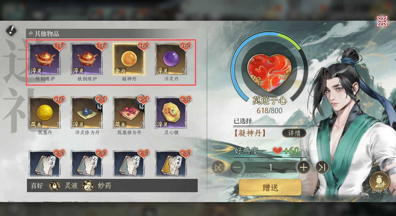 ●礼物品阶定效果:礼物品阶和价值直接决定好感涨幅,通常灵丹、功法、装备等成品灵物>灵植、灵液、妖丹等基础材料,同类别中品质越高效果越好(如金丹级材料>筑基级材料),贵重礼物更易打动 NPC。