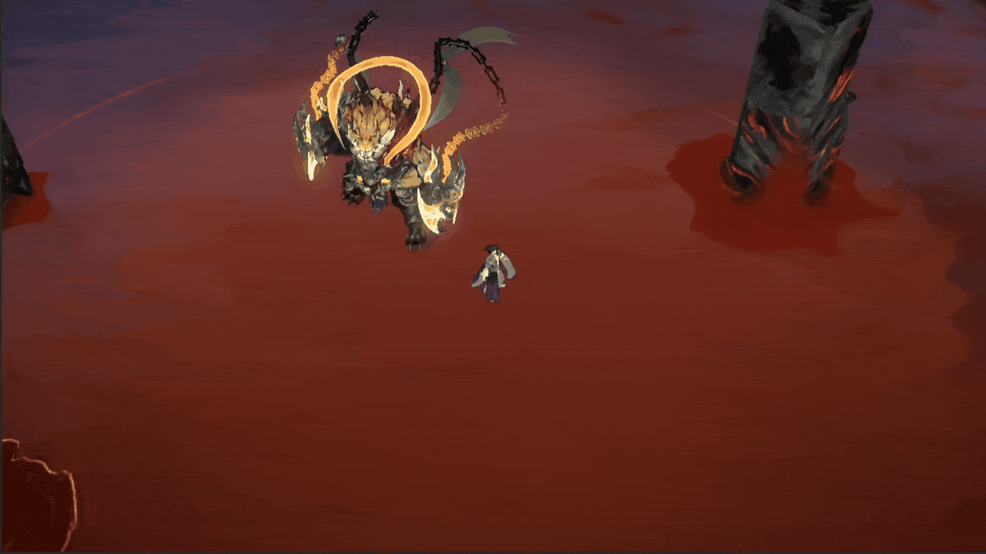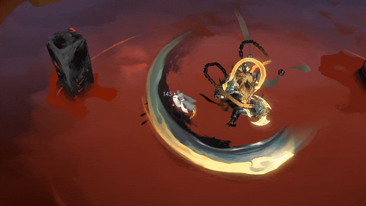 机制解析:金猊君会将斧头插在地上拖动,并向玩家发起冲锋,对撞到的玩家造成伤害,同时停下对身前的玩家造成一次额外伤害。