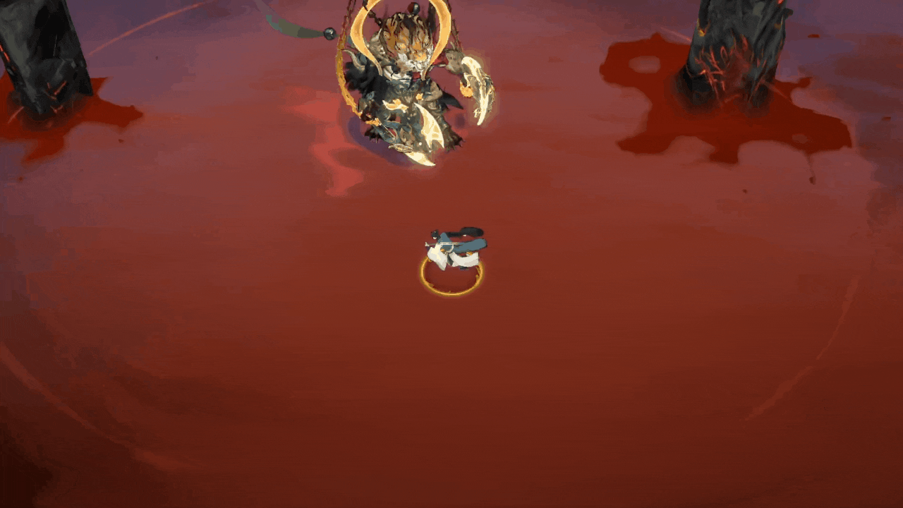 机制解析:金猊君会把双斧插入地下,身边出现 3 个浅色环形圈,随机选 2 个引爆,一共 3 轮。