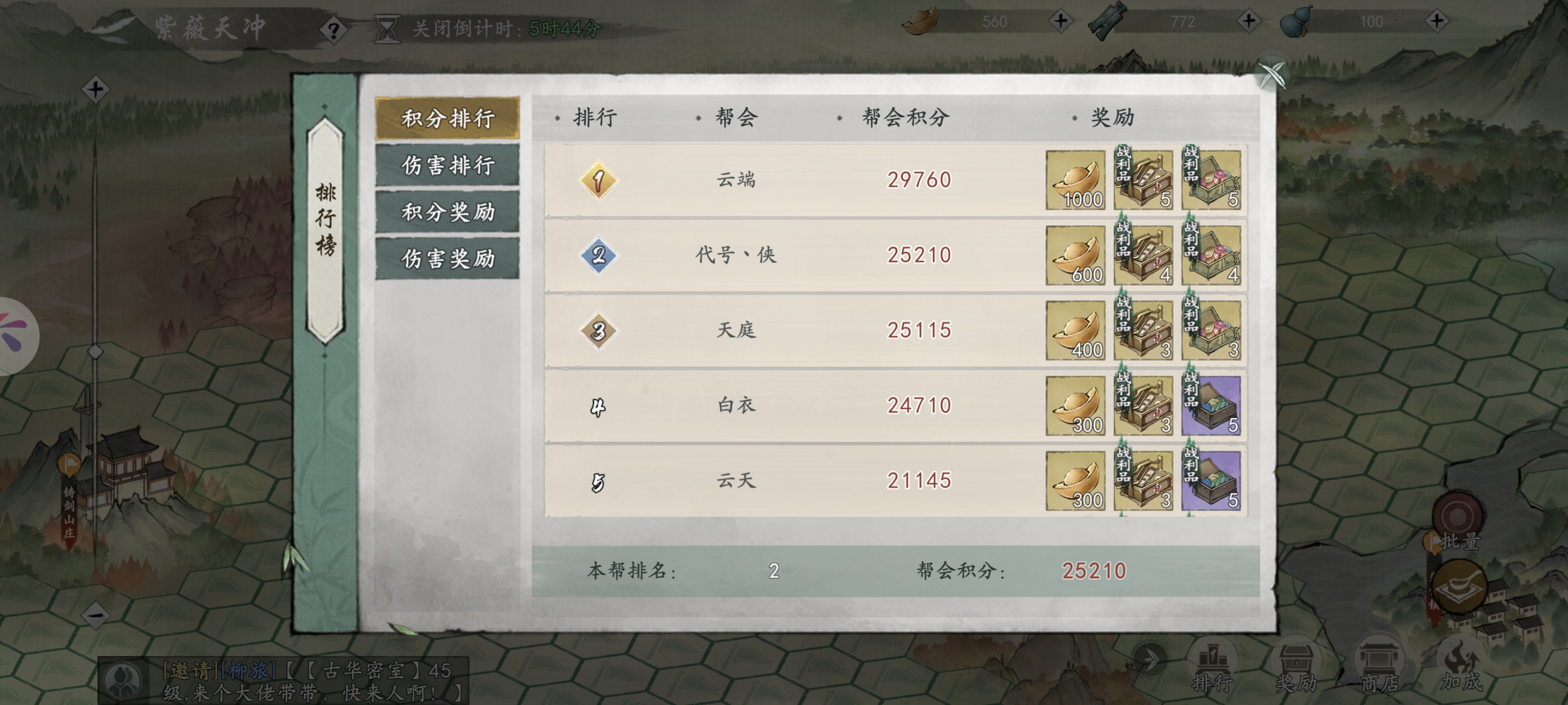 4.现阶段基本帮派已经定型,一定要找一个活人多的帮派,不然活动奖励领取不完,亏得很,能进前5工会最好,不推荐新萌乱找工会,因为有很多工会,都是让人捐献斧头,看你战力低就给你踢了,很不友好,希望设置一个每天踢人上线,不然总会有非分之想的人。