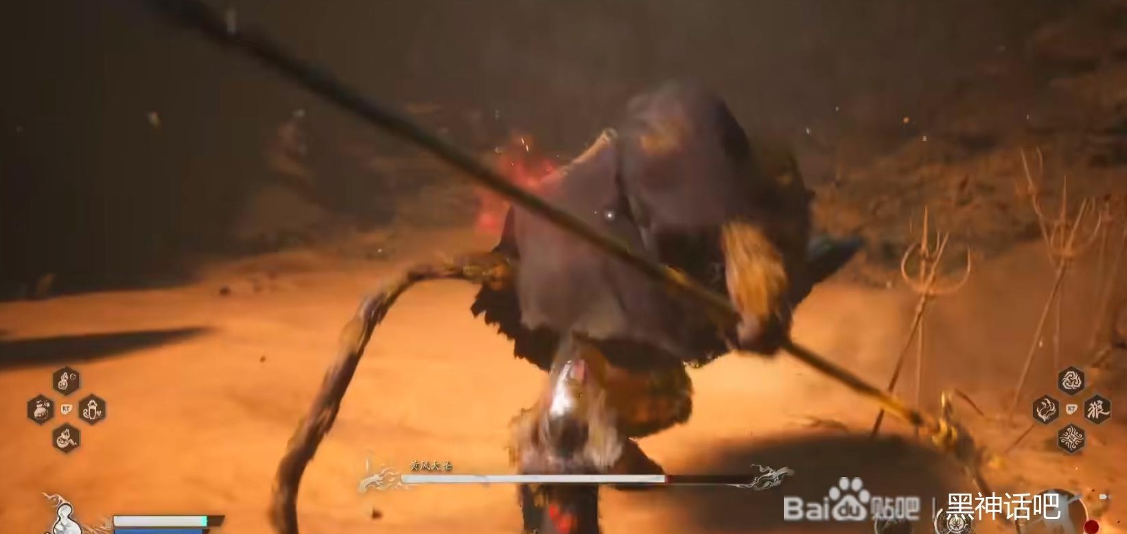 再后就是它的血量在百分之六十只左右会开始踩脚进入二阶段,所以我们直接就是控制住血量,我们直接使用出定身术,使用出蓄力三段,甩在它的身上,再上前补上几棍,将血打到一半之多。不然二阶段它的攻击手段会变多,加上会进出黄风沙壁的话会更加难对付,那时想要磨血的话就比较不容易了。