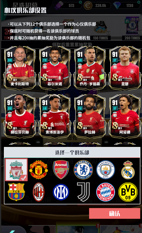 玩家可以在游戏中的星选招募中选择利物浦作为自己的心仪俱乐部,增加抽到利物浦球员的概率,并且保底时可随机获得一名该俱乐部的球员,并且每160抽的累抽奖励位该俱乐部的随机包。