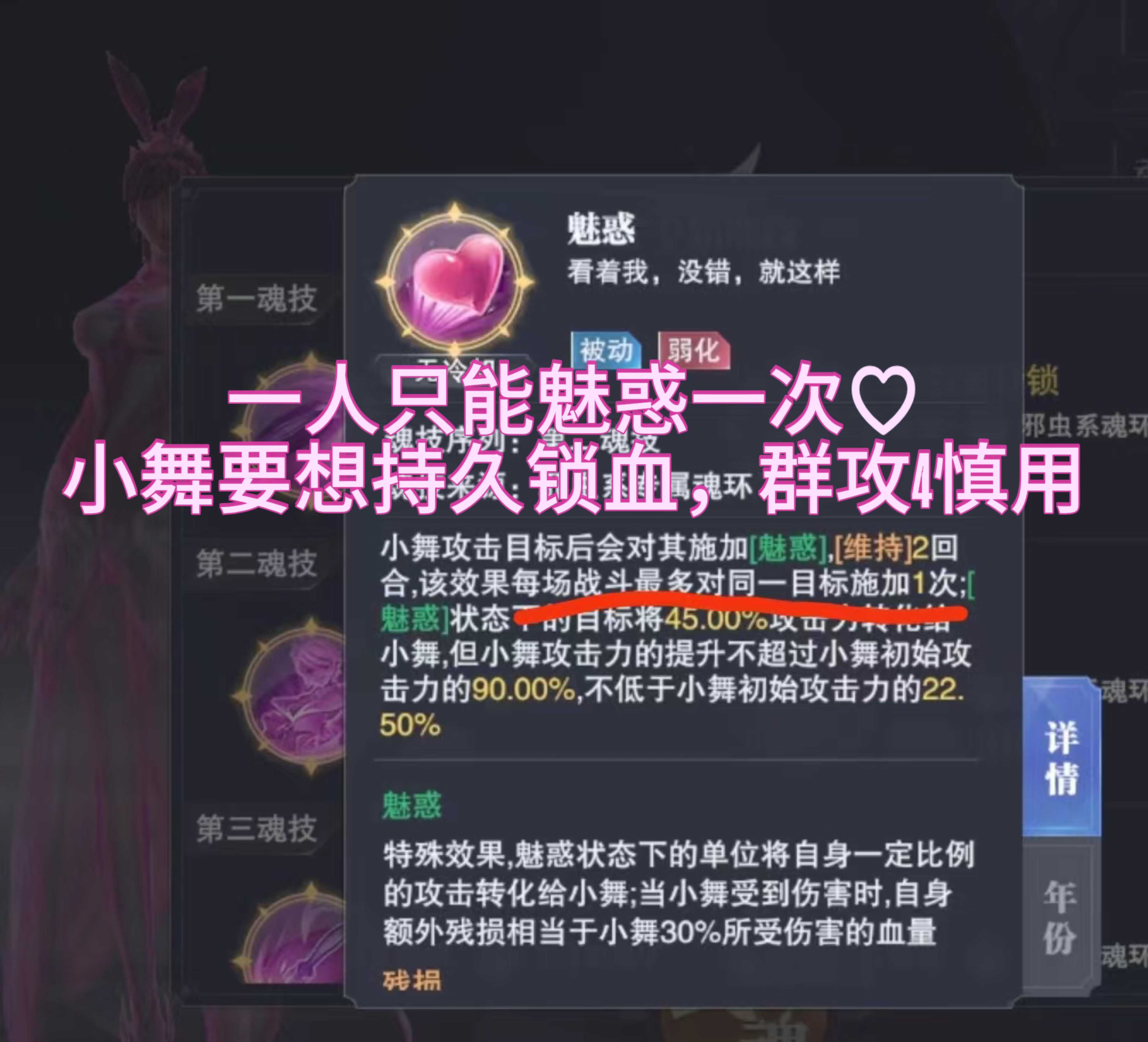 魅惑被动小舞:对面身上有魅惑时免伤。