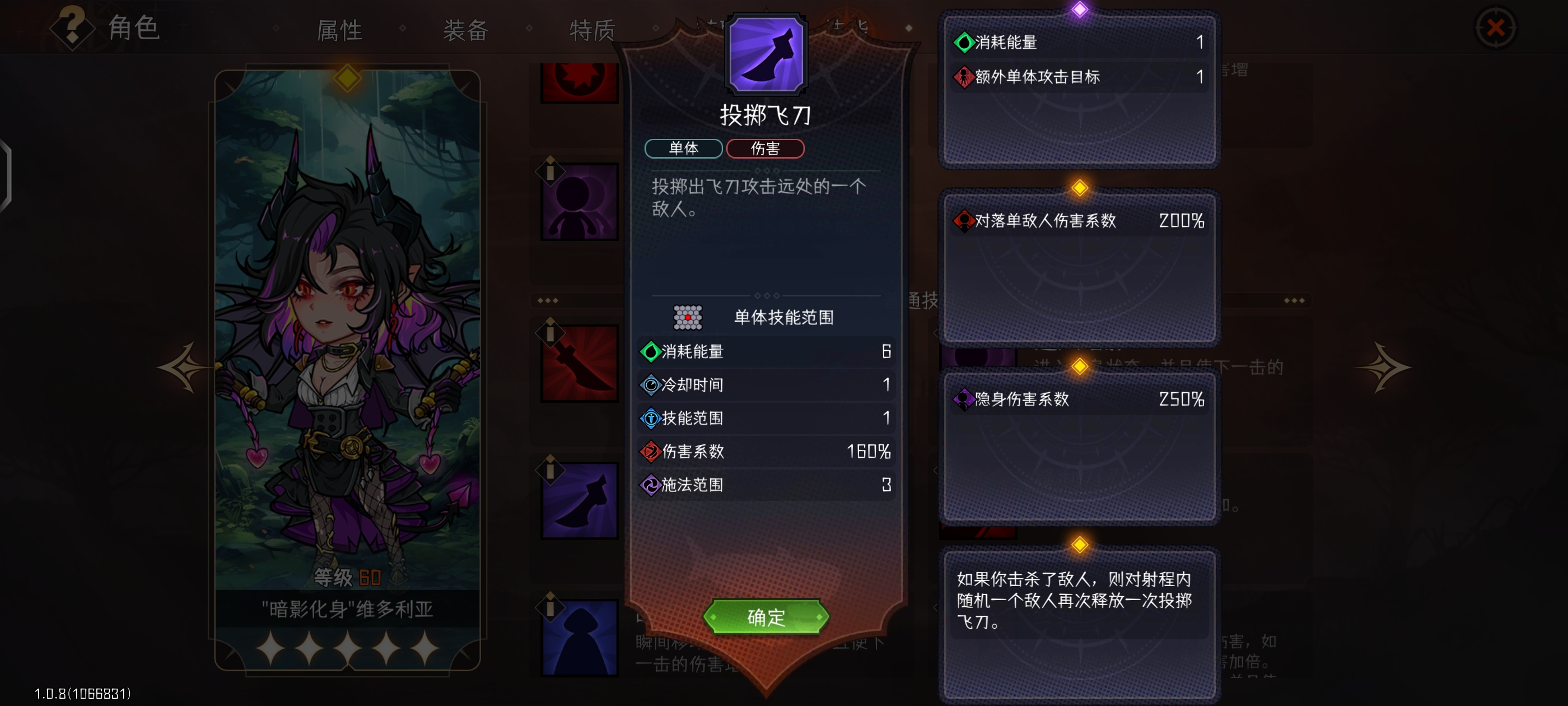 暗刺身为单体C,刺杀在非高难十分好使,在高难后刺杀伤害骤降。可能需要点出25%血以上视为满血才伤害正常,点出3倍伤害才有可能高伤害。在前两节点都点不到,建议重开。