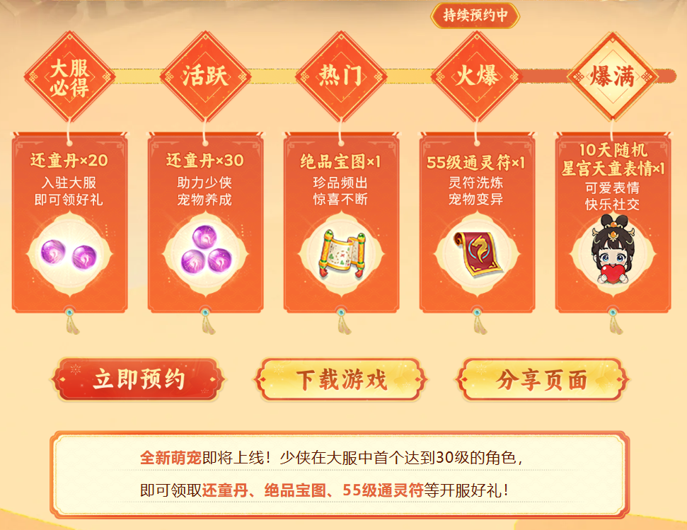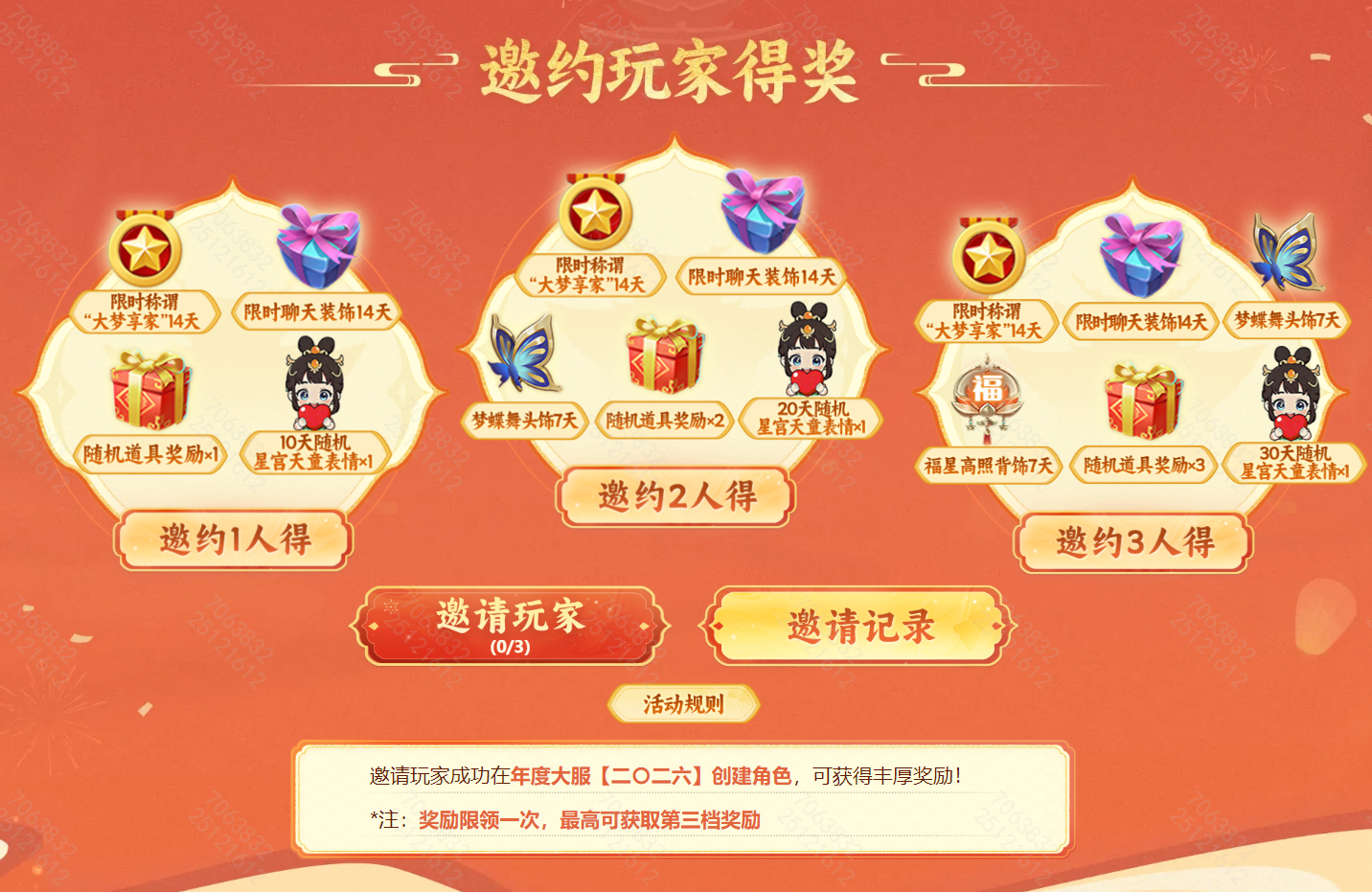 参与邀约有礼活动,邀请新老玩家在大服完成预创建,即可获得随机道具、限时称谓、限时聊天装饰、全新星宫天童表情等好礼!