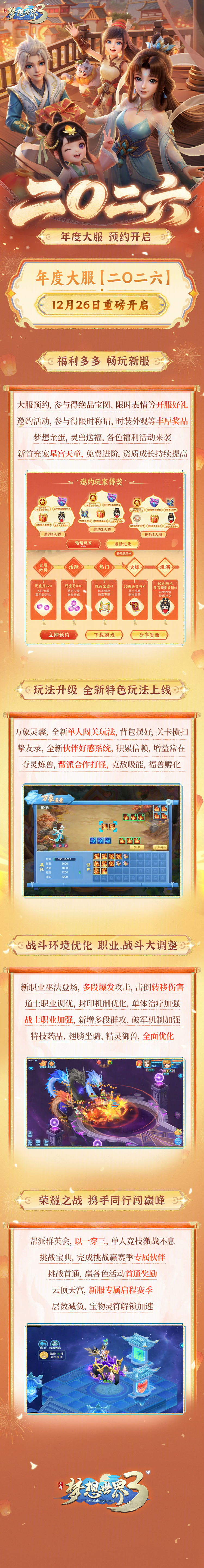 梦想世界3年度大服“二〇二六”12月26日重磅开启,大服预约活动现已开启!如下: