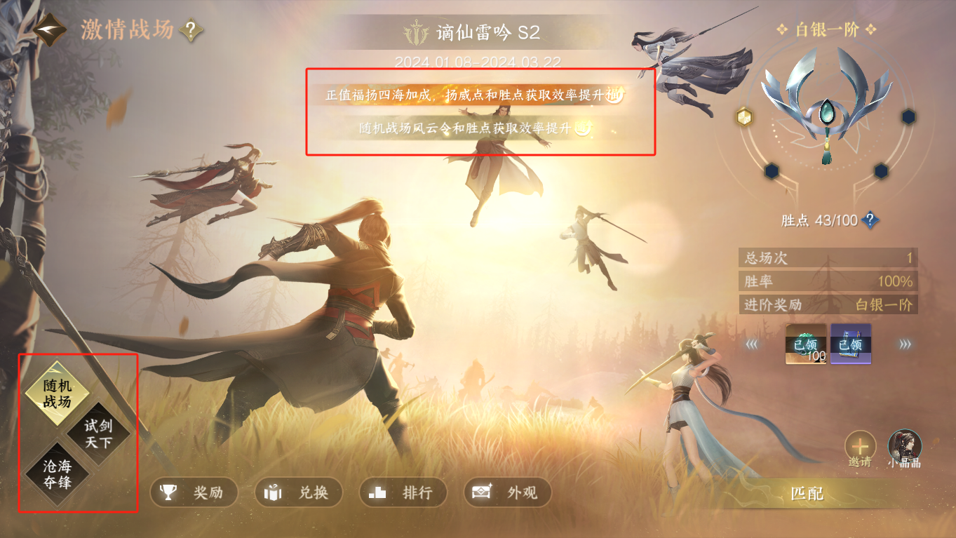 目前激情战场里有胜点加成,选择一个自己喜欢的玩法开始即可。