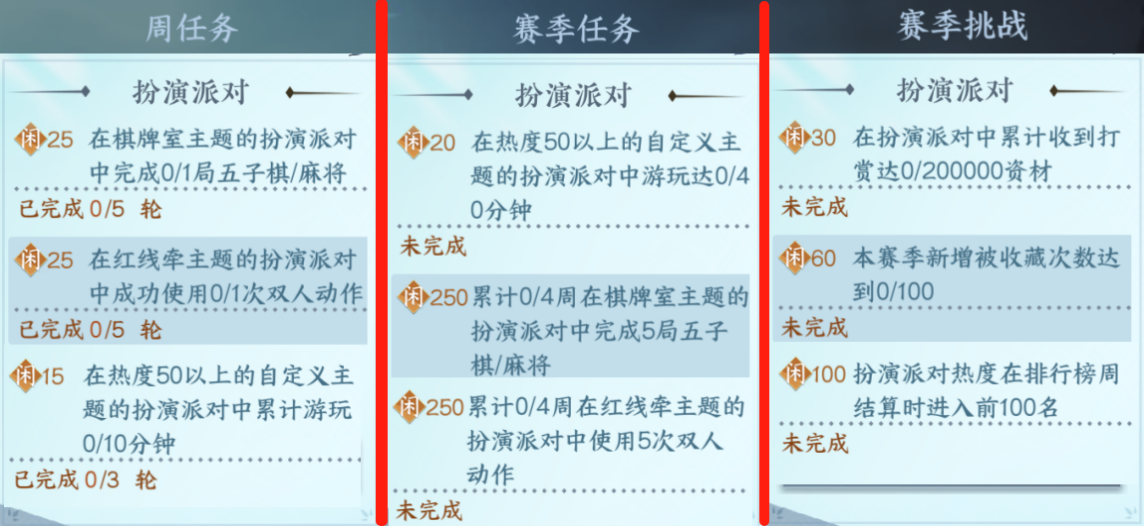 1.周任务在室主题的扮演派对中完成一局麻将/五子棋/5轮,红线牵主题完成双人动作/5轮,在热度50以上的派对玩10分钟/3轮。