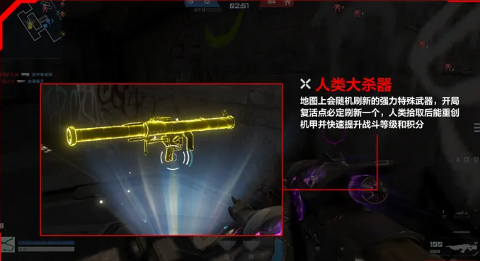 2、大杀器:地图上会随机刷新大杀器,人类可通过接触进行拾取,大杀器的伤害远超普通武器,对机甲可以造成更有效的伤害。