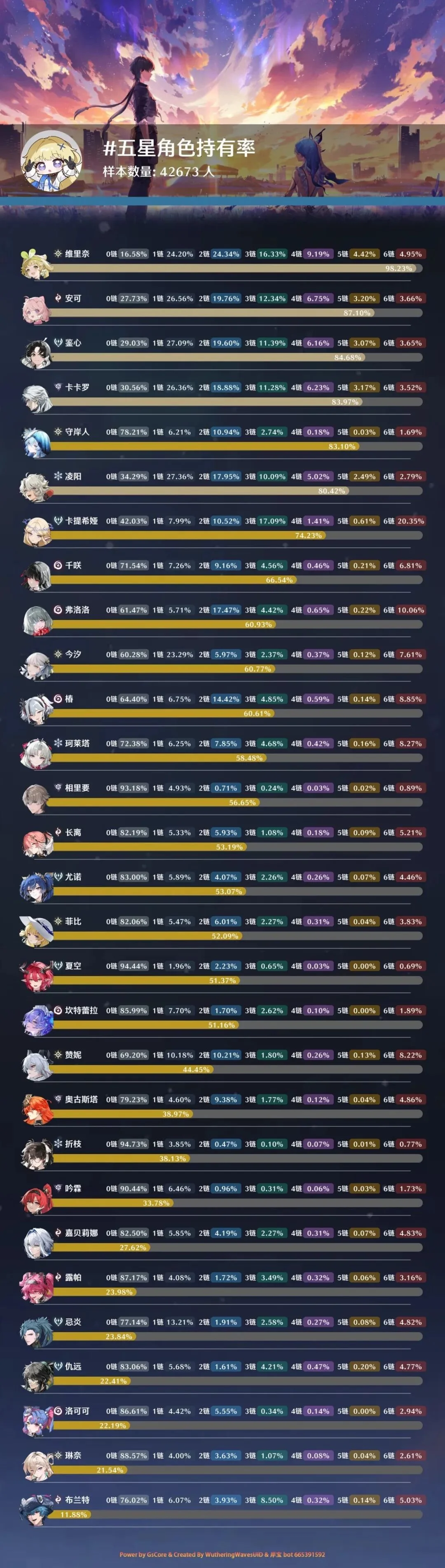 鸣潮《鸣潮》3.0持有率排行:琳奈零链占比88%,千咲多链抽取破圈如下: