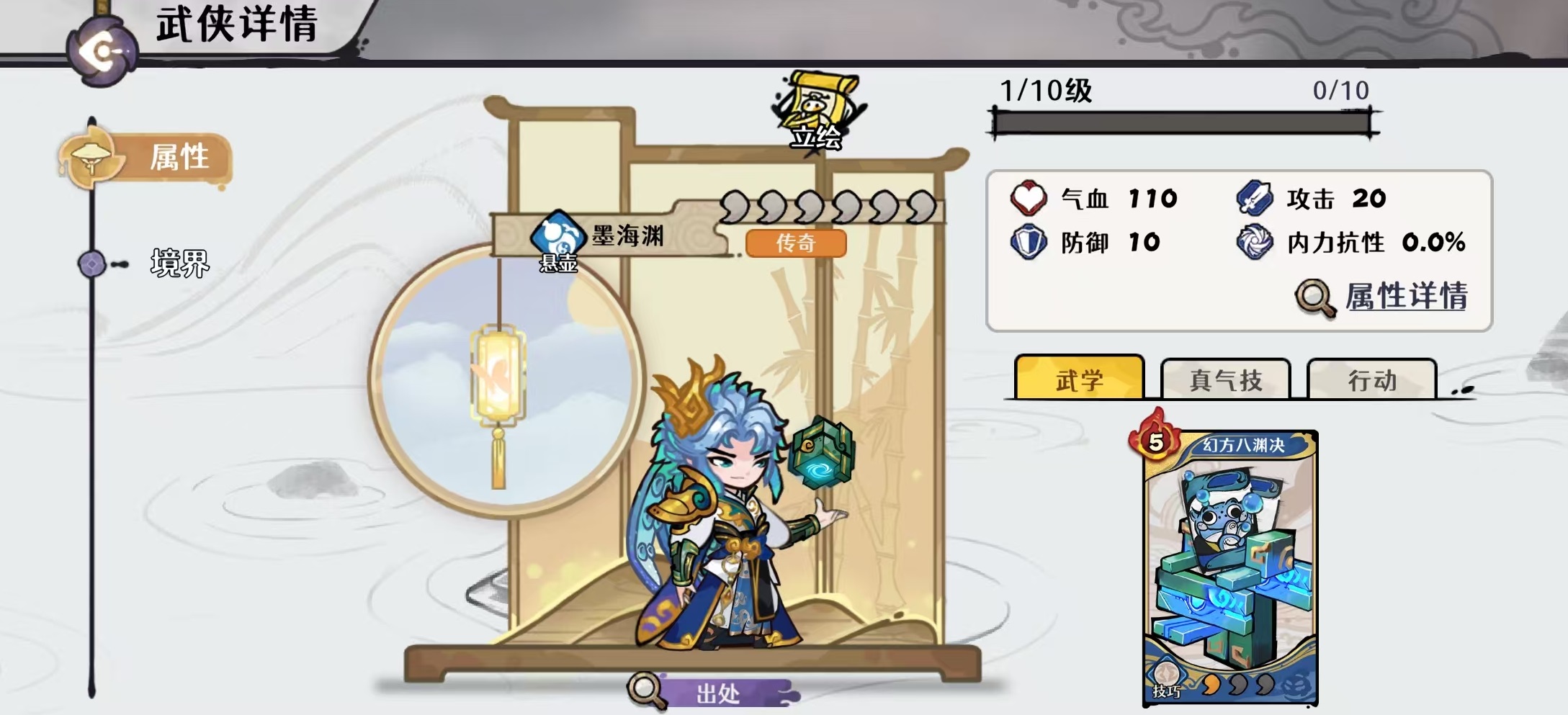 其核心武学“幻方八渊决”可在触发时为友方武侠发现各一张无形武学牌;同时,手牌中每存在一张中立牌,该技能怒气消耗即降低1点,最多减少3点;且于回合开始时自动返回手牌,保障持续可用性。真气技能则在行动开始时恢复1点真气,并允许免怒气打出两张怒气消耗大于1的少年技巧牌;若实际打出数量不足,则按缺失张数补发对应数量的无形少年技巧牌(每缺1张即发现2张);战斗开始时真气自动回满。这一机制使其成为水系技巧流体系中的启动枢纽,兼具续航调控、资源补充与战术容错能力。二命后实现质变,无论在推图开荒还是高难幻境中均具备广泛适配性。