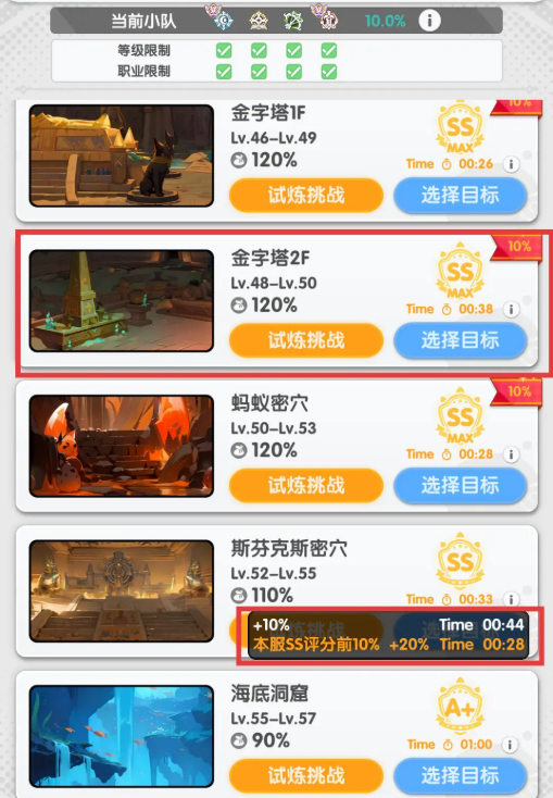 2、以SS通关后,会获得110%的经验加成,但当你地图通关时间在自身职业的通关者里排名前10%,则会有额外10%的经验加成。