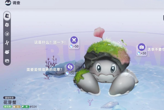 草+土属性的小螃蟹,拥有几种不同颜色的地区形态,平常躲在图里面,需要靠近或者使用技能才能找到它,地图探索技能有遁地和碎岩,可以躲避远程攻击以及探索石头后的地穴宝藏,前期非常实用。