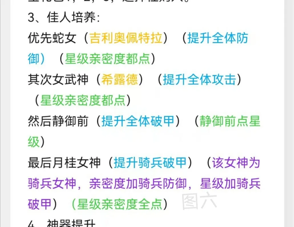 3、佳人的提升优先骑兵发育,先主打一个赵云,把面板拉起来。佳人提升顺序如见图六,在此基础上小编更要补充西施和示巴女王。因为西施提升骑兵的攻击和破甲属性,示巴女王提升骑兵的攻击和攻击属性,对英雄的不断强化很重要。 4、天赋的加成让英雄有很可观的面板,需要大量的兵符,可以通过酒馆精英招募获取。不论是玩家和月卡玩家,都要努力的点满赵云的第一页天赋。氪金玩家点满第二第三页天赋。加油,小伙伴们。