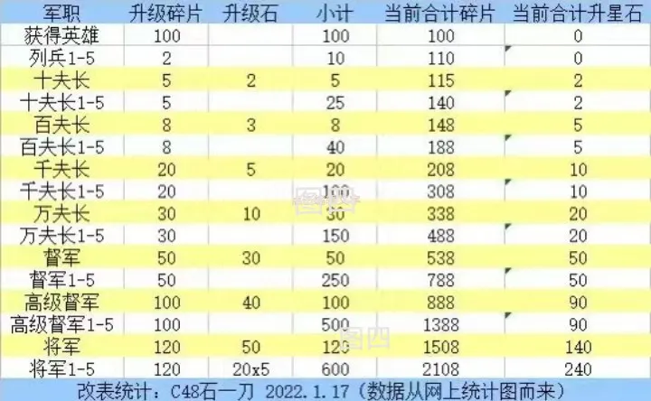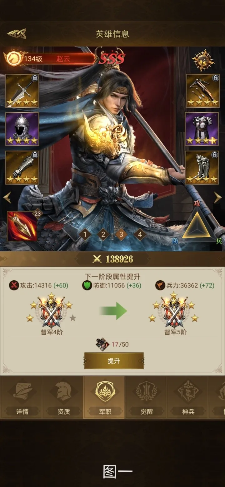 2、军职:提升赵云的军职也可以提升赵云的相关属性。如见图四,赵云每一个阶段所需要的碎片和军阶石,那么,如何获取这些相关的资源呢?