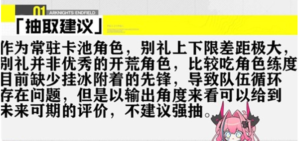 单从输出潜力来看,别礼仍有成长空间,可以评价为“未来可期”。但综合性价比不高,不建议为了她进行强抽,更适合作为自然歪到后再培养的角色。