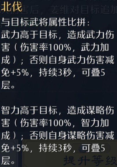 姜维的北伐即便比拼失败依然能叠25%武力和谋略减伤,这是其他辅助所做不到的。