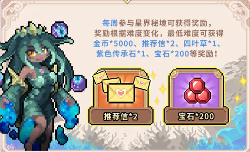 每周参与星界秘境可获得奖励,奖励根据难度变化,最低难度可获得金币5000、推荐信2、四叶草1、紫色传承石1、宝石200等奖励。