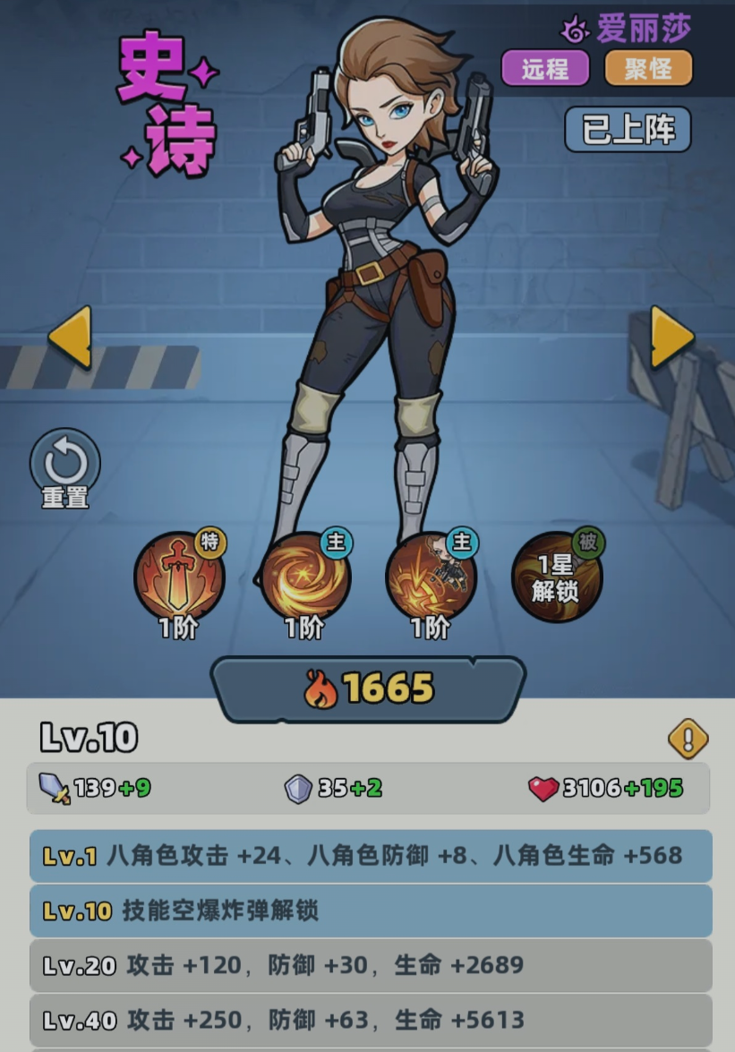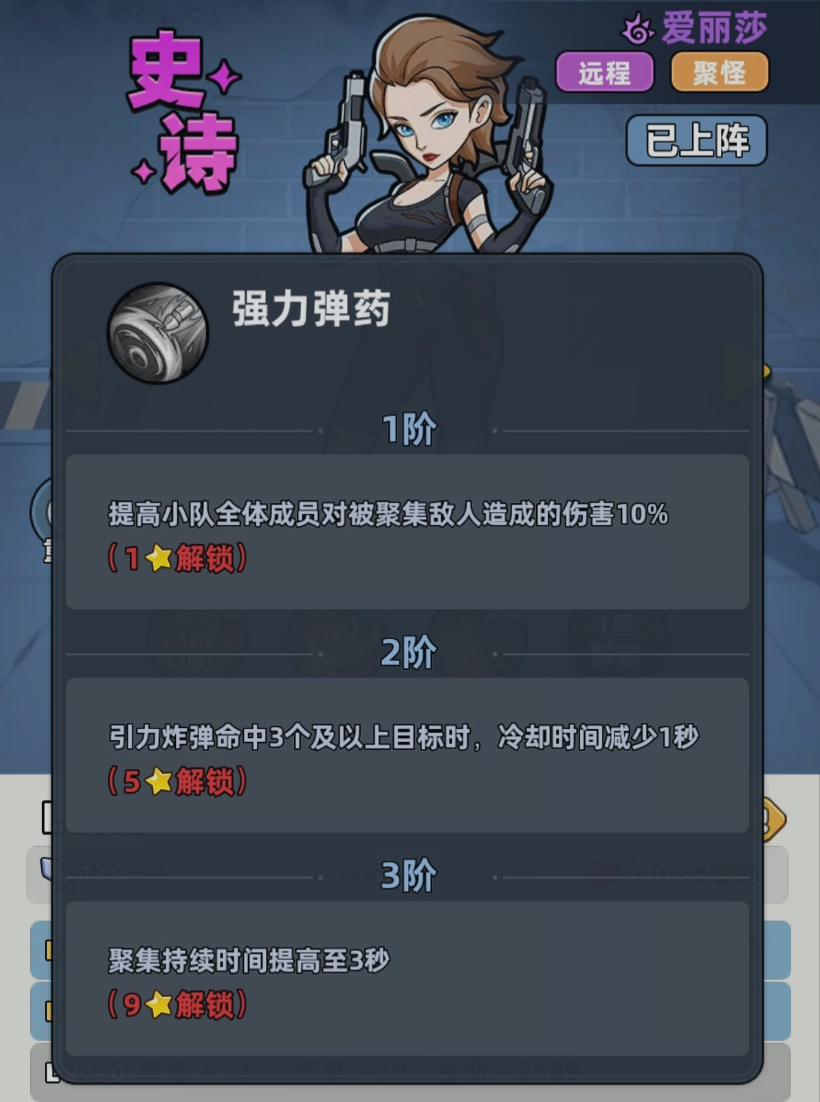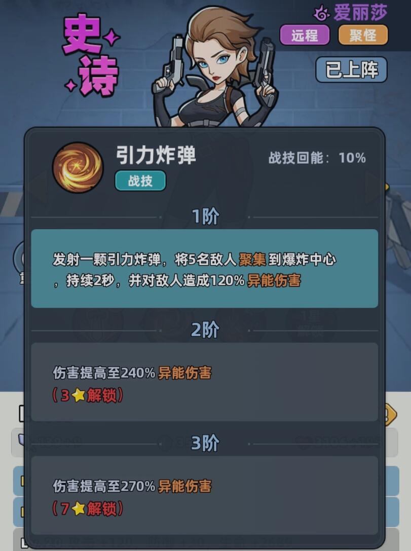 爱丽莎在游戏中作为辅助,她实现的是远距离作战,对于玩家来说,它能够聚怪,控制,属性是比较扎实的,一旦当他的等级得到提升之后,能够逐步的增加攻击、防御跟生命属性。当爱丽莎还处于一级的时候,能够为整个队伍提供攻击、防御和生命的基础加成。一旦10级解锁空爆炸弹的话,往往让他的技能体系的实力变得更加的强悍。这时候不仅对范围内的多名目标造成伤害,更关键的是还能够对已经被聚怪的敌人追加额外的伤害,正是因为这些技能形成了闭环,所以他才能够给整个队伍创造更好的输出环境。
