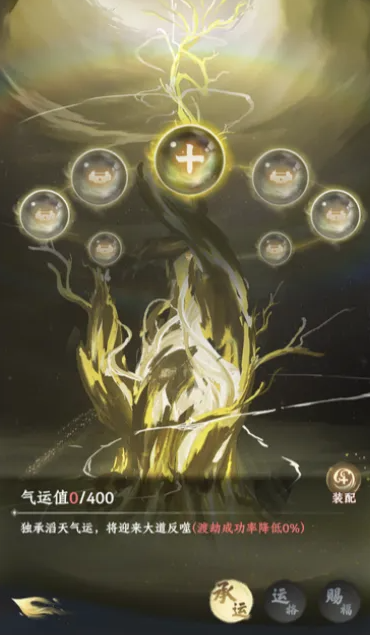 气运系统在后期大家挂机修炼当中是非常有用的一类系统,因为在这里大家就会找到一个更适合自己进行叠加的增益能力,在修炼界面当中大家就可以看到气运系统的入口,在其中可以看到目前气运数值的积攒,一般情况下会给大家展现一个承运神树,在神树上面大家可以看到体现的气运格位是什么,一般情况下在新手进入游戏当中的时候,只会为大家开启一个气运格位,这个格位是空置的时候大家会看到的,需要进阶进行突破了以后才可以解锁更多的格位,最多的情况下,这里的运气格位可以突破到8个,所以在格位突破越多的情况下,大家可以通过其中装备带来更多天命承载的效果,另外大家要注意,因为这里的气运跟天道是绑定的,所以一定要注意,如果在这里遭受到天道反噬的话,每一个气运当中都会有承载数值,品质越高的承载数值,上面会得到的数字越大一些。