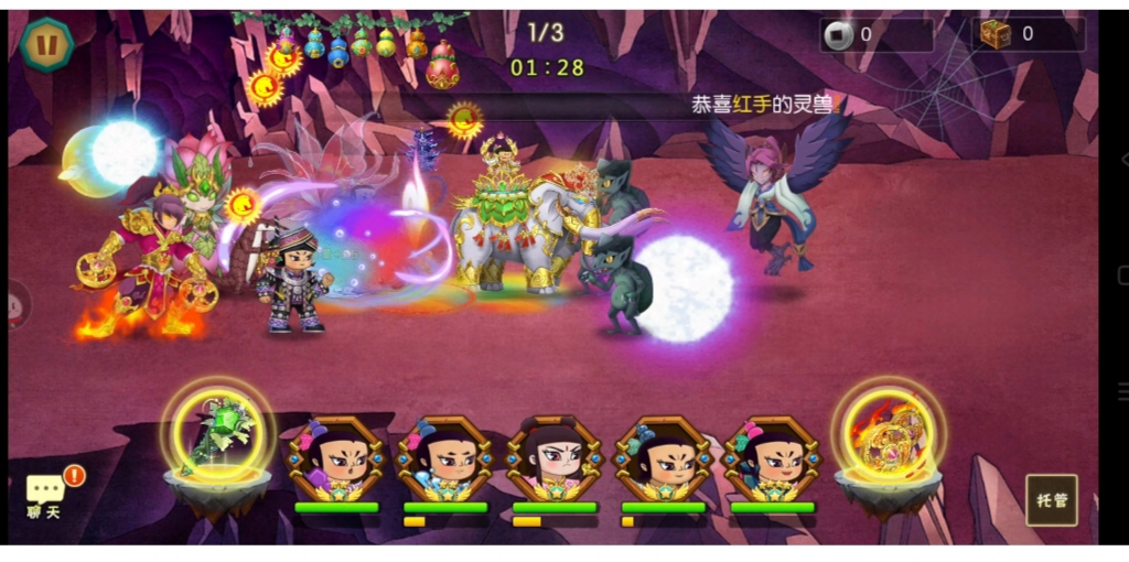 第二小关,进场四只怪物,两只河童两只鹰身人,怪物没有带法宝。因为上场保留了娃子技能,这局进场不放法宝,释放所有娃子技能,技能过后平打就行,有技能就释放,风火轮留在下一关使用,成功赶在增援上场之前通过。