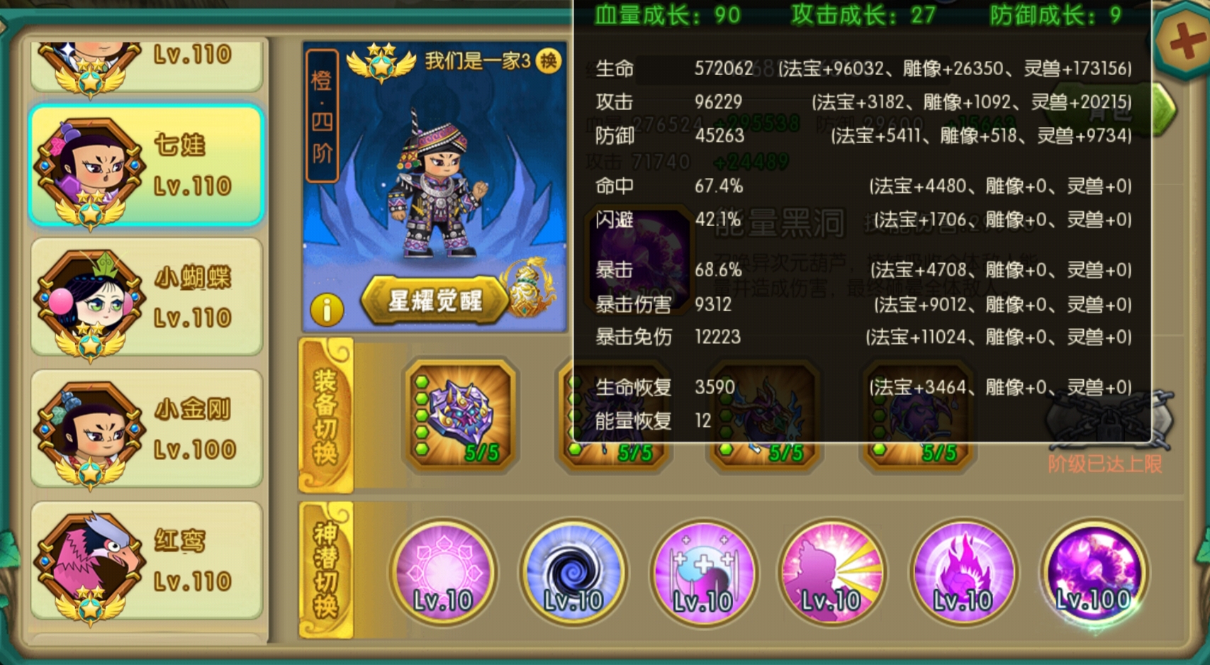 道具:降妖令牌,所有娃提升百分之四十五攻击。十星七彩莲蓬给大娃金刚五娃使用。