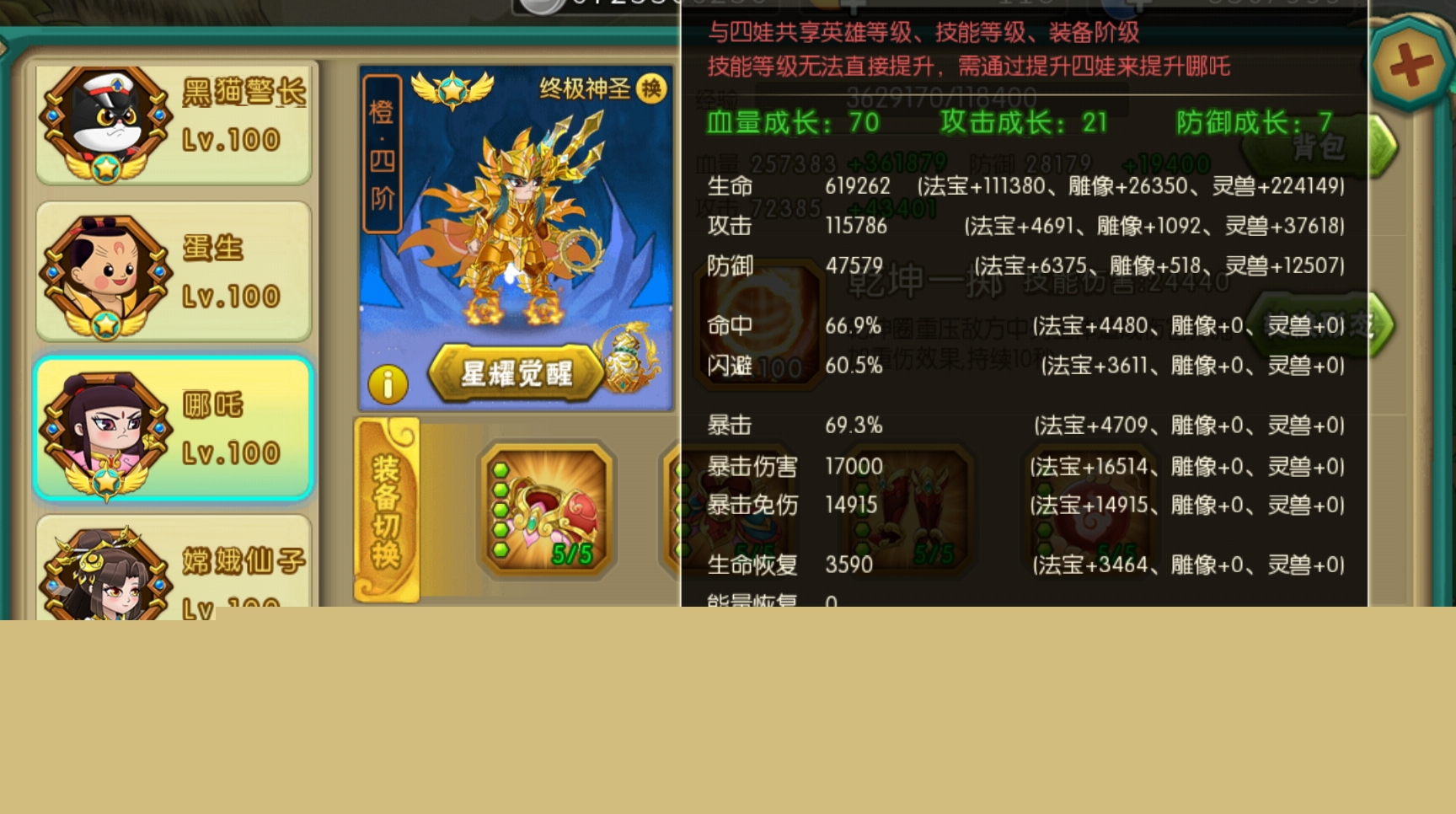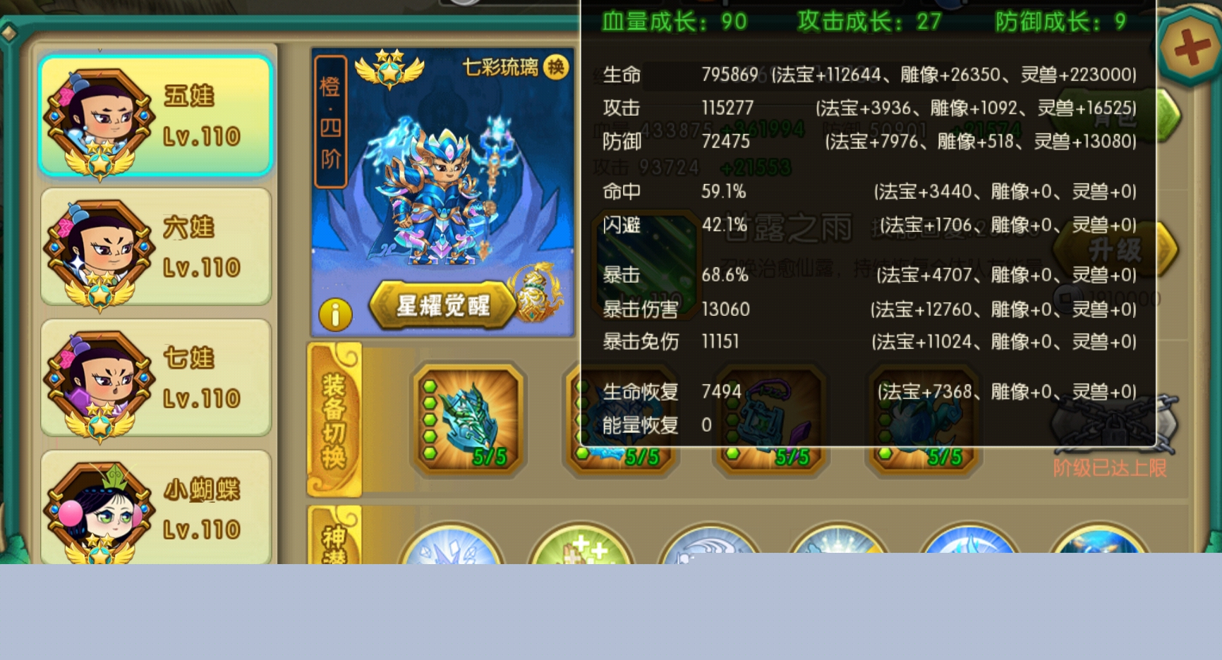 上阵娃:大娃二阶神兽,用六潜技能,五娃三阶神兽,用原技能,七娃,用六潜技能,金刚骑寰蒂用六潜技能,哪吒骑一阶亢金龙,用六潜技能。