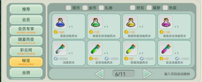 获取方式:其余获取方式可以通过商城→秘宝获取不同等级的洗练药水如下图: