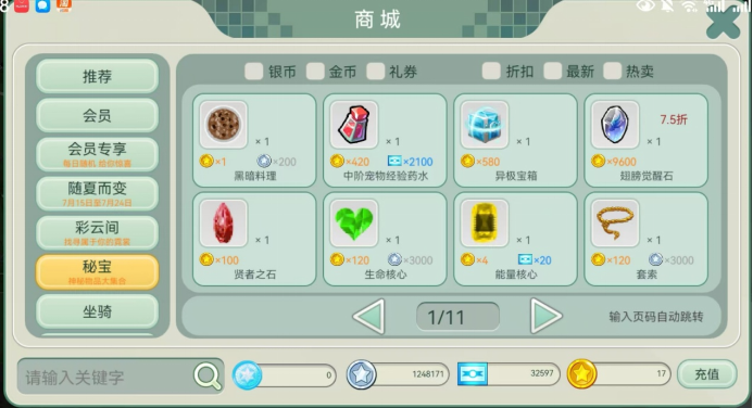 这一步我们需要点击左上角商城,然后点击秘宝,根据需要抓捕的宠物;来选择所需要的套索为普通套索还是高级套索。