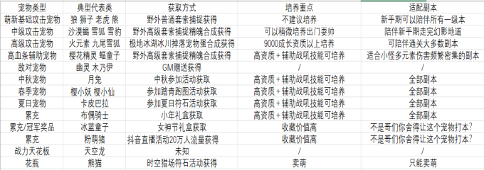 主流平民玩家宠物首选火元素跟樱花精灵,这两种宠物出极品的概率较高,且技能方面也可以应对大部分副本,实用性高于很多花瓶活动宠物,推荐作为0氪党的首选。下面这张图是创造世界全部宠物获取方式及推荐(仅个人观点)