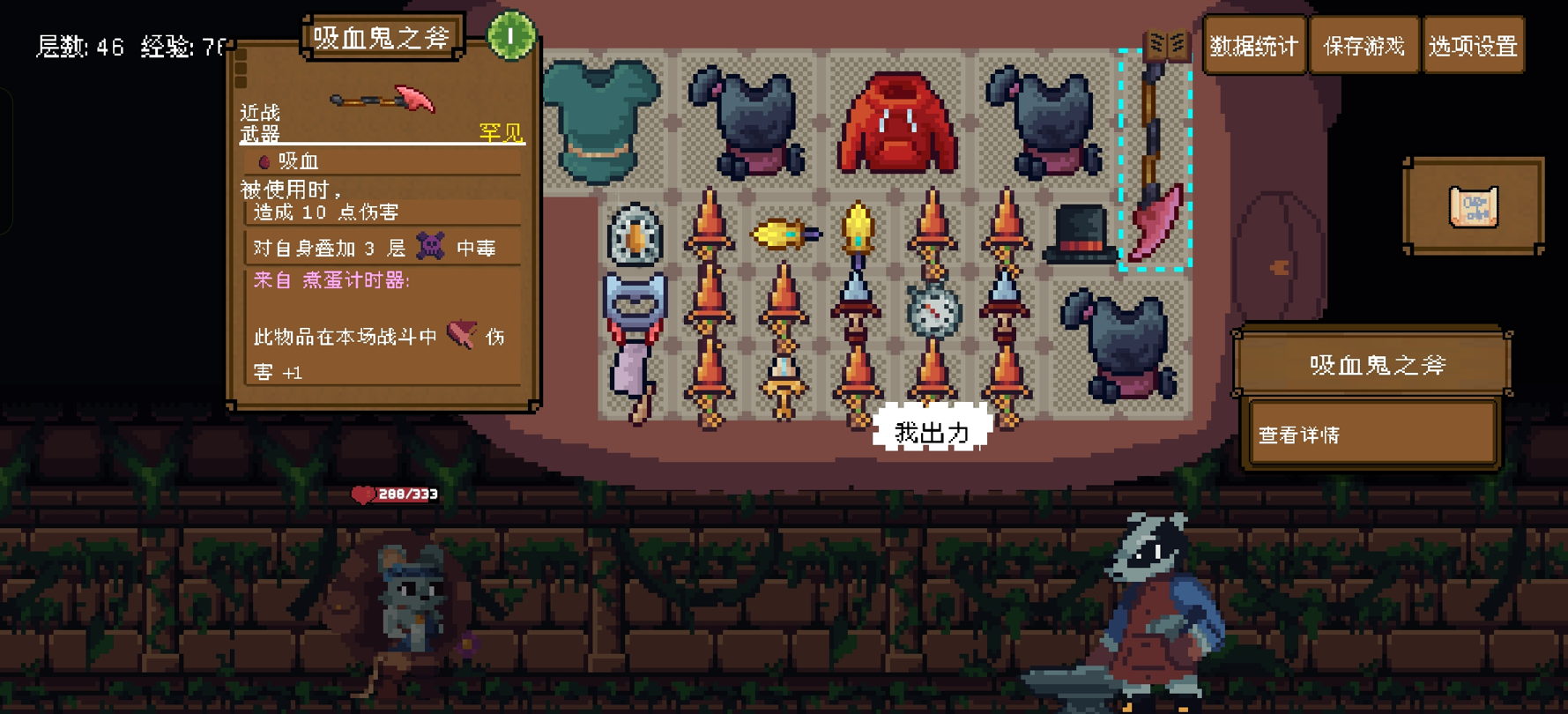 装备无限制强化模式,狂怒流还是爽,就是刷不出来厨刀,有群体触发厨刀就解放双手了。前期看准时机用秒表过度。后期礼帽和煮蛋器再加上多层闪避可以无限刷钱,血甲加最大生命防暴毙,没血了吸血鬼之斧一口奶满。第一波可以先用秒表控一波,剩余能量叠加狂怒,第二波基本就乱杀了,前期最好留残血给能爆金币的,后期无所谓了。运气实在不好可以找找相似词条的关键装备。