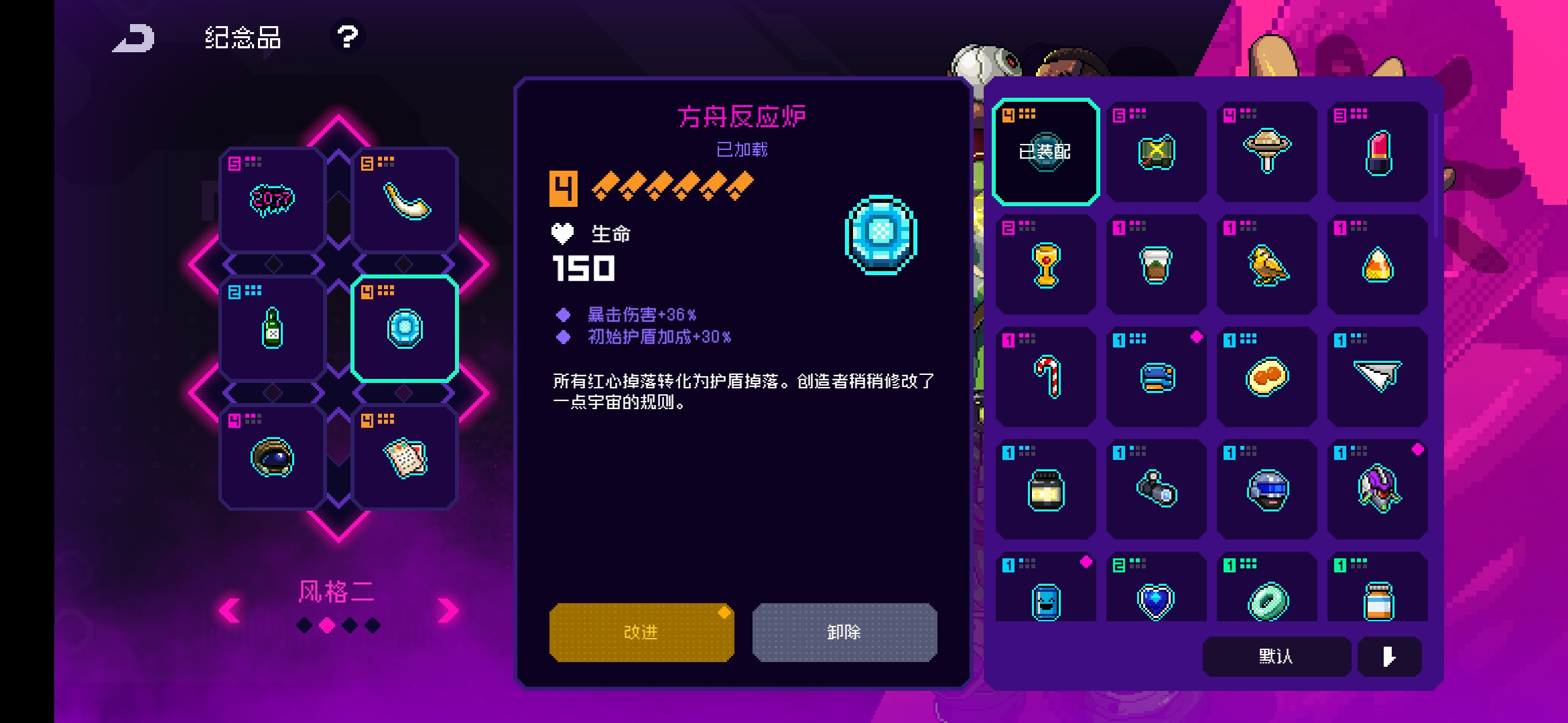 3,核心纪念品方舟反应炉(副本大部分掉落都是红心,护盾需要特殊房或者某些纪念品效果才能掉落,方舟可以让所有掉落的红心都变成护盾,哪怕你在商店看到红心,你买了之后他从货架掉落下来也会变成护盾)也是天赋解锁(同爆米花解锁一致)。