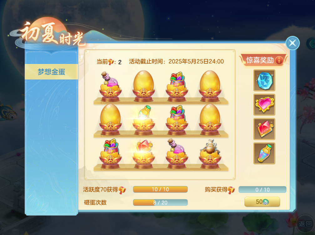 全新活动“梦想金蛋”限新服开启!累积活跃度获得锤子,砸开金蛋即可获得道具奖励。