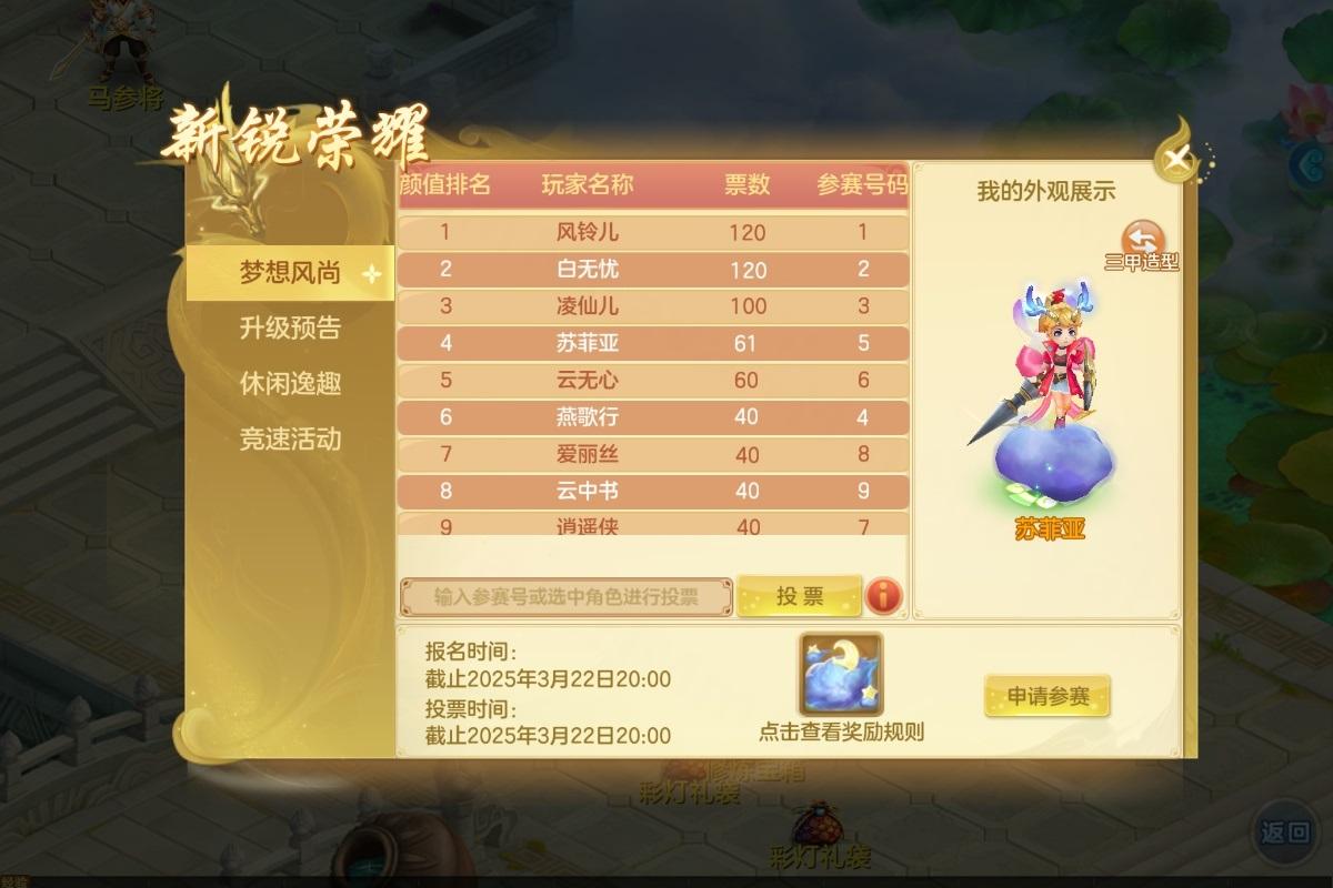 开服首日将开启梦想风尚活动,满足报名要求的玩家可参与梦想风尚的颜值比拼。得票最高的前10名少侠可获得相应的称谓奖励,获得前3名的少侠更可获得特殊坐骑“祥云·夜”兑换信物。