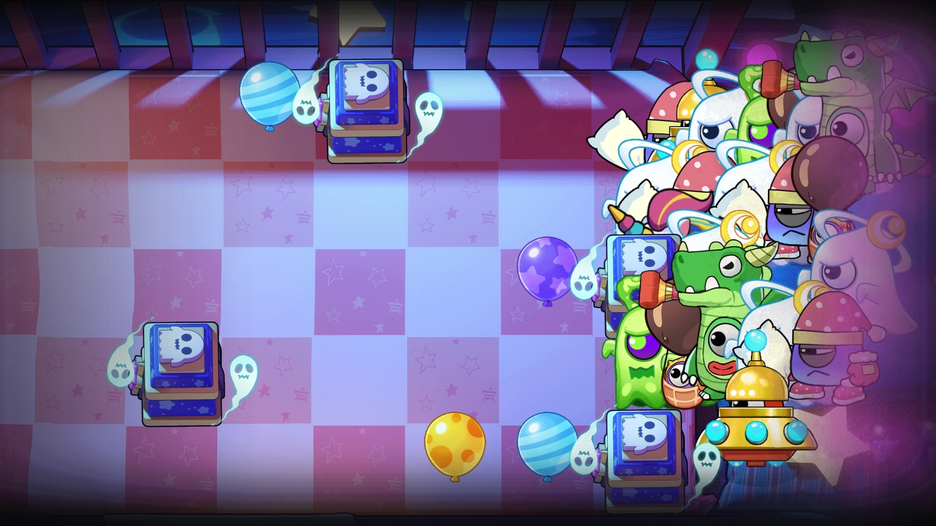 新增设施幽灵盒,每过25秒召唤幽灵机,刚召唤的幽灵机可以被角色阻挡且正常攻击。幽灵盒相比停机坪血量没那么厚,可以靠灌伤打掉或直接用小熊折掉。新增设施彩色气球,血较脆,打破会对周围3×3所有单位眩晕2秒并造成800伤害