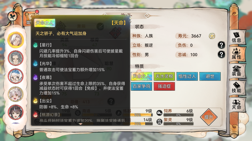 对于后勤弟子则根据需求选择对应的奇才词条即可,比如说在宗门30级之前需要24个培植奇才弟子,6个聚灵奇才弟子,9个商道奇才弟子,3个炼器奇才弟子,2个符箓奇才弟子,8个高机缘弟子游历,1个高魅力弟子招募,2个炼丹弟子。需要注意的是战斗弟子一定要与后勤弟子区分开来,避免出征战斗找不到弟子或者弟子出征导致灵田停产的情况,其次后勤弟子一定要修改名字,避免逐出弟子的时候出现误逐的情况。
