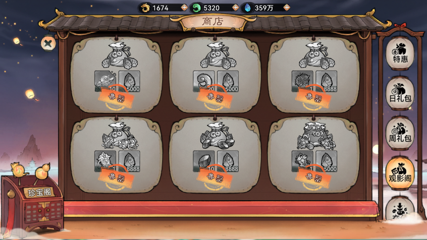 30级前推荐每天把世界探索令牌购买次数用完,30级后则可根据自身灵玉数量和材料需要是否购买次数。除此之外日礼包、周礼包中灵玉礼包建议购买,前者可以给加速卷或者会给天道传书礼盒运气好可以开出金色功法。领取每日礼包后一定要观看观影阁视频(ps:观影阁要从玩游戏的第一天开始就保持观看哦,除了可以免费获得灵石、仙玉、招募令等重要资源之外,每天还可以获得一个古宝的10张碎片和1个挑战令)