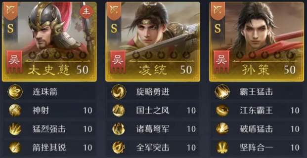 3、备注:兵种选择弓兵,这是上测开荒最强队伍之一。太史慈稳定连击出发多次追击,配合稳定的普攻伤害,孙策主要提供碎甲增伤和队伍恢复能力