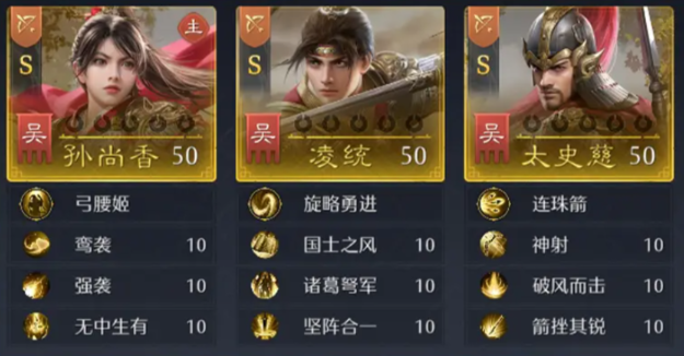 3、备注:孙尚香异常弓,兵种选择弓兵,通过太史慈追击提供稳定负面,以及凌统提供增益,来获得更多的鸾袭次数,短时间战斗内打出战损差