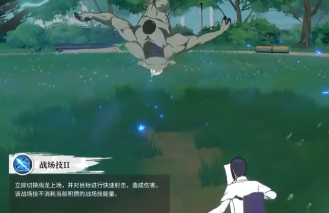 用来封灭后,雨龙会直接踩住敌人并且借着敌人的力道向后用力一条,跳到空中会对敌人射出箭矢造成伤害,此外,若是在石田雨龙的战场技生效后使用该技能,技能在命中敌人以后还将会提升雨龙i积攒的战场技能量。
