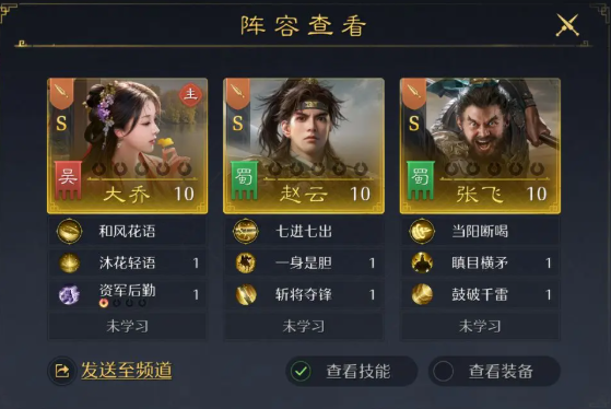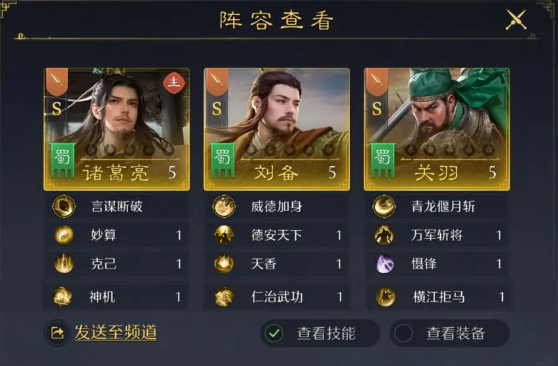 战法选择上,推荐【无中生有】【横江拒马】【刮骨疗毒】等,关羽这边更多是做控制和工具人,所以不强求他的输出能力;给诸葛亮高伤害的技能即可。