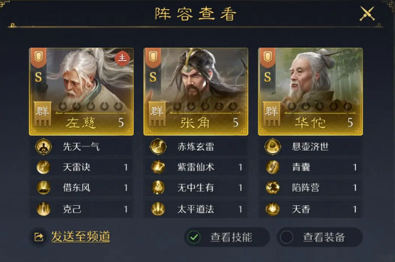 这套阵容适合所有抽到华佗的玩家,武将选择上,【左慈】【张角】可以用【周瑜】【司马懿】等智力输出武将替换。战法选择上,携带任意谋略输出战法即可。