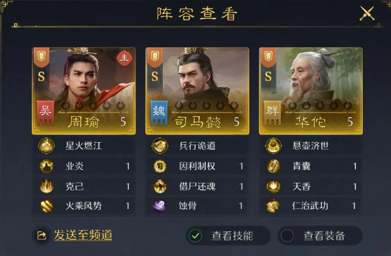 战法选择上,【蚀骨】主要是提供中毒,和司马懿和【借尸还魂】联动;【火乘风势】周瑜“专武”,华佗携带治疗技能即可。