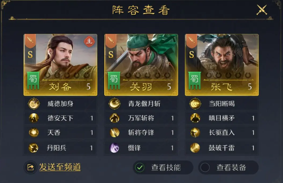 抽到刘备的玩家,上他就完事了。20级前强推做1队使用的队伍,战法兼容性好,而且控制能力足,加上羁绊携带的减伤和治疗效果,前期开荒十分好用,但是后期打架需要转型。
