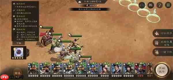 关羽·青龙突击:对正前方3格范围内所有敌军发动近战兵刃攻击,并立即向前突进相同距离; 吕玲绮·战争践踏:直线冲锋3格,撞击首个敌方单位并造成近战伤害,随后对其周围一圈敌人施加百分比兵刃伤害; 典韦·逐虎跃涧:瞬移至指定位置(最大距离3格),落地后对周边所有敌军造成近战兵刃伤害,并附加“缓兵”效果; 赵云·龙胆摄敌:向前突进3格,对落点周围一圈敌军发动近战兵刃打击; 关银屏·青龙斩击:沿直线冲锋3格,仅对路径上首位敌军造成近战兵刃伤害; 徐晃·长驱敌围:直线冲锋3格,仅对路径中首个遭遇的敌方目标造成兵刃伤害。任选其中三位武将出战即可开启战斗。