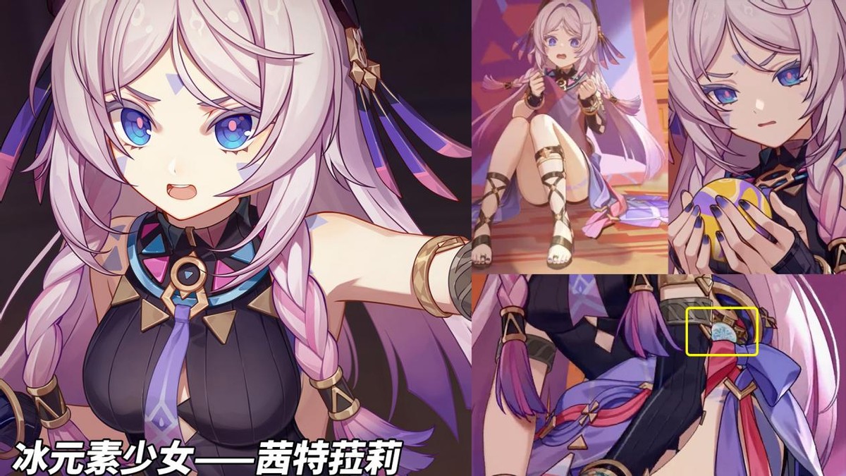可别被她的外观骗了喔!这可是冰元素角色,神之眼位于腰间,不注意很容易遗漏。初看配色,粉紫粉紫的,我也错以为是雷元素角色。PV镜头给的不多,但人物性格还挺明确。看似冰冷高傲的少女,受到意外惊吓时也会露出慌乱、一脸嫌弃的小表情。